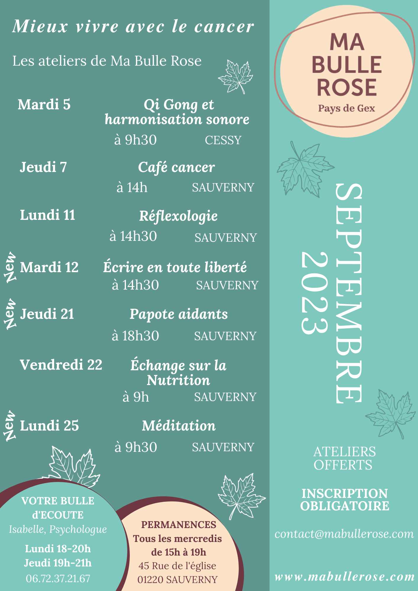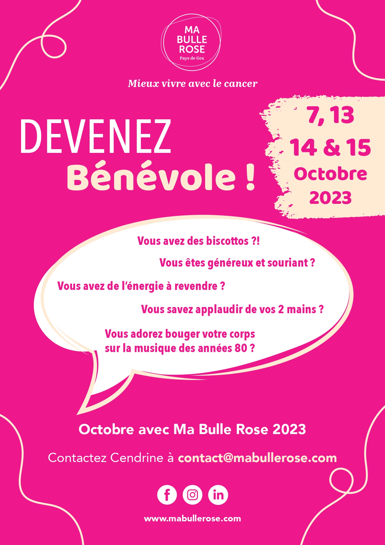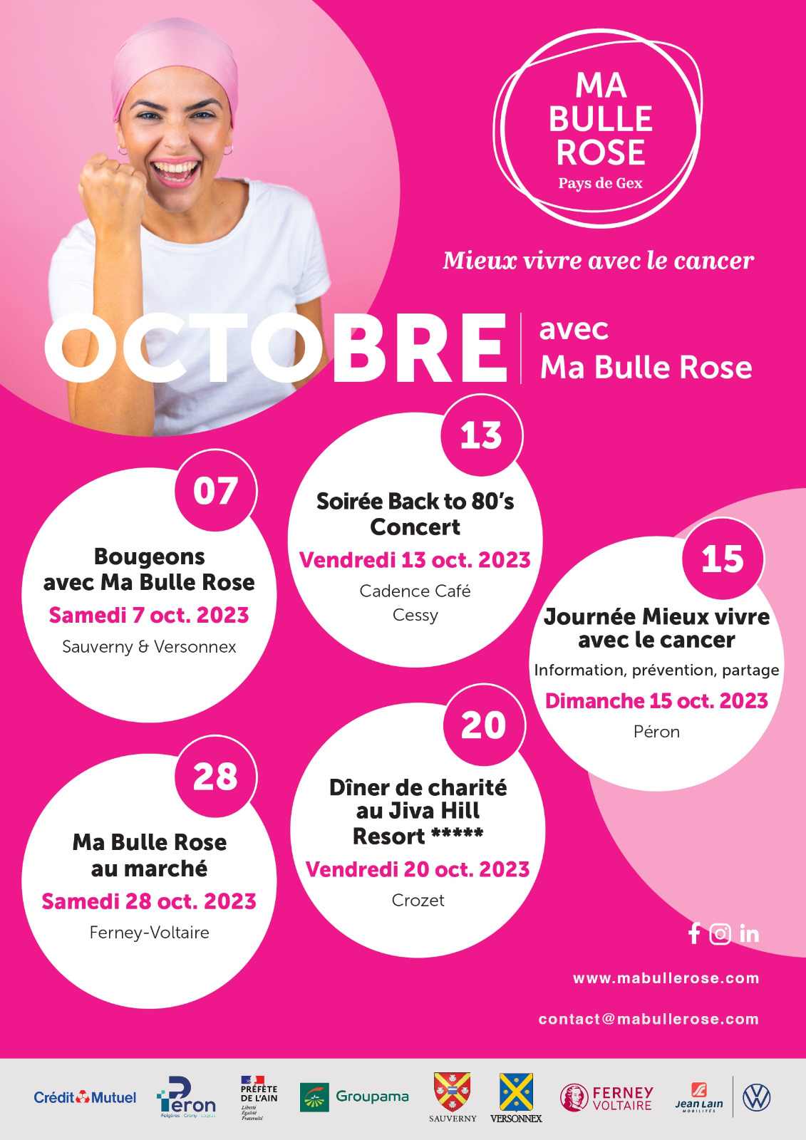 Ma Bulle Rose Pays de Gex est une association à but non lucratif à destination des femmes malades du cancer ainsi que leurs aidants. Nous les soutenons en proposant des soins de supports afin de « mieux vivre avec le cancer », tant par l’information, l’organisation d’Ateliers « Mieux-être », ainsi que par la liberté de s’exprimer grâce à des groupes de paroles et une bulle d’écoute.